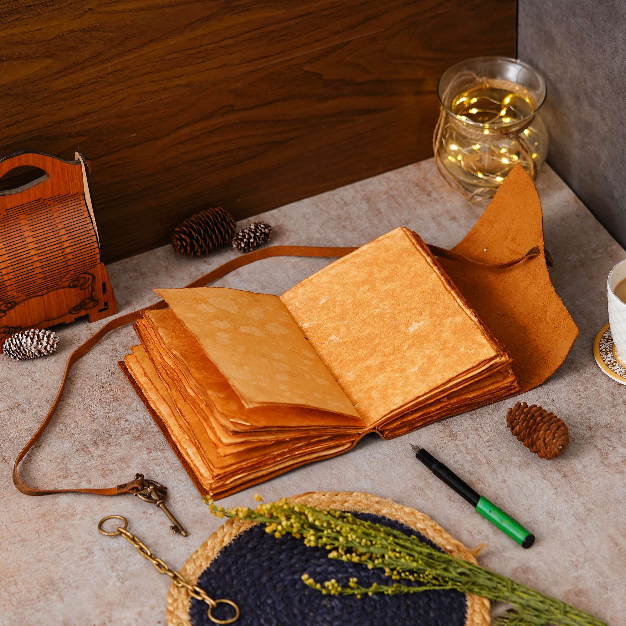 Capture your thoughts and memories in style with this exquisite handmade leather journal. Crafted from genuine leather, it emanates an authentic vintage charm, perfect for those who appreciate the finer things in life. The premium antique key design string closure adds a touch of sophistication, ensuring your journal stays securely closed when not in use. Inside, you’ll find 200 brown handmade pages, providing ample space for your creative expressions, sketches, notes, and musings. Whether you’re a writer, artist, or simply someone who enjoys the tactile experience of putting pen to paper, this journal is sure to become your cherished companion. Give the gift of inspiration to yourself or a loved one with this timeless piece that celebrates the art of handwritten expression